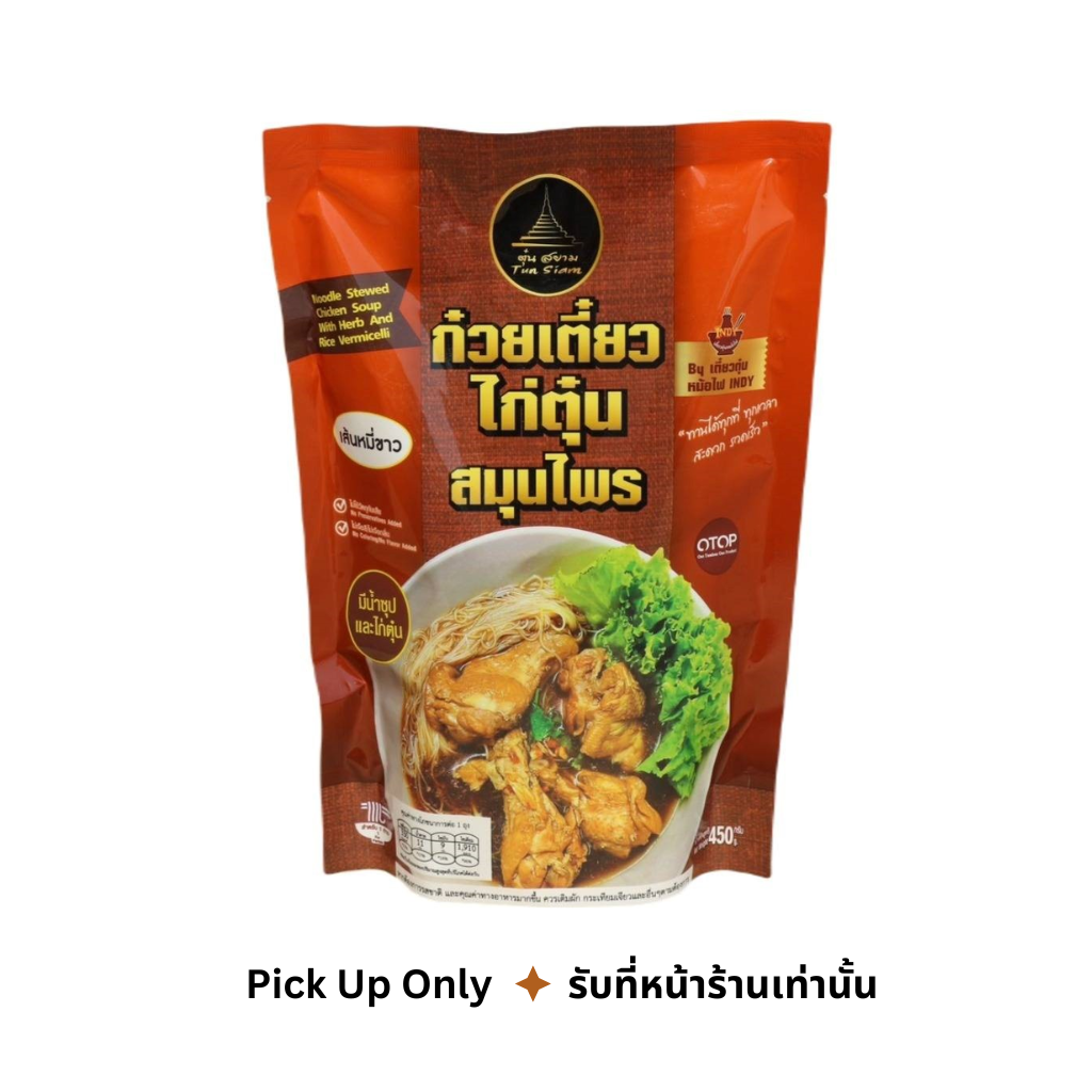ตุ๋น สยาม ก๋วยเตี่ยวสมุนไพร เส้นหมี่ รสชาติไก่ 450 กรัม 1 ลัง มี24 ซอง ตุ๋น สยาม เป็นผลิตภัณฑ์ก๋วยเตี๋ยวสำเร็จรูปพร้อมทานมีเนื้อสัตว์ตุ๋น น้ำซุป เส้น เครื่องปรุง เก็บได้นาน 365 วันโดยไม่ต้องแช่เย็น ผลิตโดย บริษัท เตี๋ยวตุ๋นหม้อไฟอินดี้ จำกัด(ประเทศไทย)